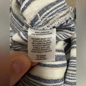 Stylish A-line skirt with blue and white stripes. Features button-down front. Perfect for casual outings.