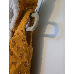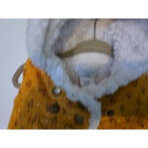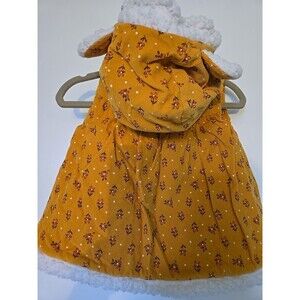 The product is a cute and cozy Aspen Kids girls size 3-6 months yellow hooded soft fur lined yellow corduroy vest. This vest features a floral pattern, sleeveless design, snap closure, and 100% polyester lining. It is machine washable and perfect for keeping your little one warm during the winter and fall seasons. The outer shell is made of faux sherpa material, with polyester insulation for added comfort. Designed by Baby Aspen, this stylish vest is ideal for baby girls looking to stay snug and stylish.