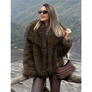Womens Faux Fur Coat Lapel Open Front Fluffy Shaggy Jacket Darkbrown