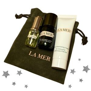 LA MER Skincare Set & Pouch | Travel Size (3pc) | Velvet Green Drawstring Pouch