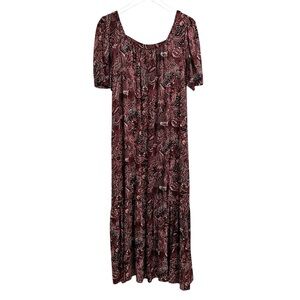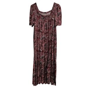 Anthropologie Maeve Lisabetta Paisley Bohemian Midi Maxi Dress Burg Pink Black Small. Square neck with a puffed short sleeve. Side zipper. Relaxed, loose fit. 100% Viscose. Satiny feel. Machine wash. Approximate length from shoulder to hem 50”. In excellent condition.