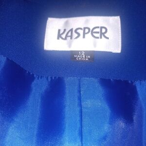 Sophisticated royal blue blazer and skirt by Kasper. Ideal for office wear. Features a sleek button-up design.