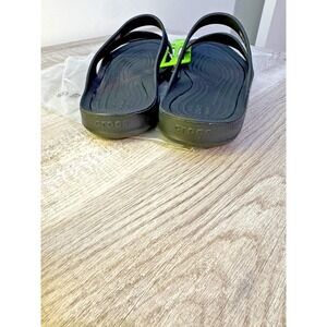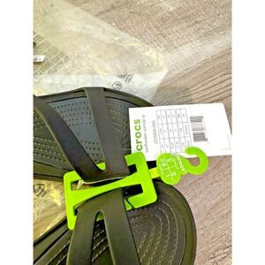Womens size 7 Crocs Swiftwater Sandal in Black is a stylish and comfortable slip-on sandal perfect for casual occasions. Featuring a strappy slide design, it has a low heel height for all-day wearability. Made with lightweight and cushioned synthetic outsole material, this vegan-friendly sandal is breathable and ideal for wear in all seasons. The black color and solid pattern make it a versatile choice that can be styled for outdoor activities, city outings, or sports. This brand new Crocs sandal with tags is a must-have for women looking for a practical and trendy footwear option.