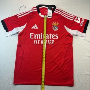 The Adidas Benfica 25-26 Home Jersey is a Men's Large red short-sleeve soccer jersey, perfect for showing support for Benfica during matches. Made by Adidas, this officially licensed jersey is designed specifically for male fans of the team, featuring the iconic team colors and logo. Perfect for wearing to games or everyday to showcase your team pride, this jersey is a must-have for any Benfica supporter