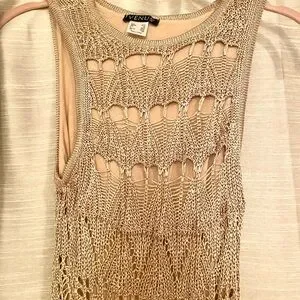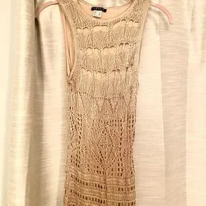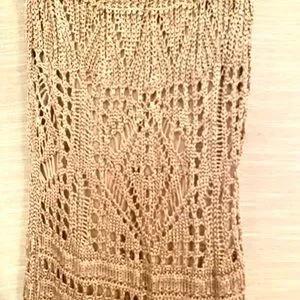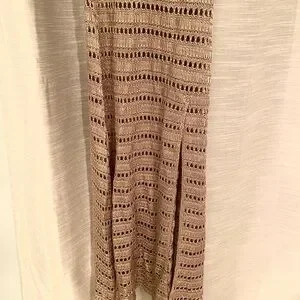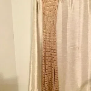 Beautiful crochet maxi dress in a soft gold color with a subtle shine. Perfect for special occasions. Lined. Side slit. New without tags, Never worn. Size XS but can also fit XXS.