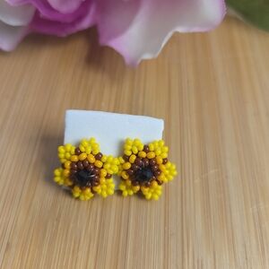 Bright yellow beaded flower earrings with brown and black accents. Perfect for adding a pop of color.