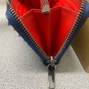 Good used condition blue pebbled leather Christian Louboutin panettone spike zip wallet.