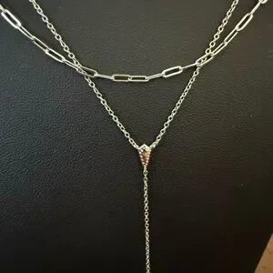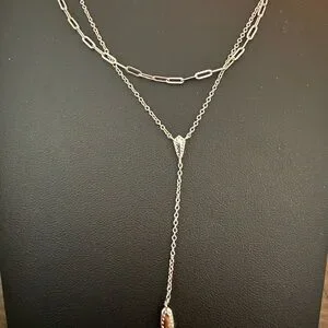 Features: Paperclip chain, Y-lariat design, multi-strand look