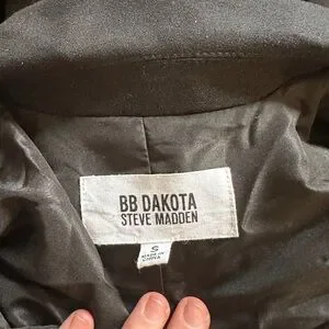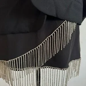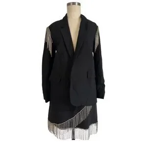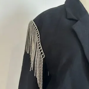 Blazer: Steve Madden BB Dakota Elegant black blazer featuring stylish silver fringe detailing. Perfect for adding a touch of sophistication to any outfit.