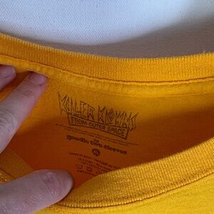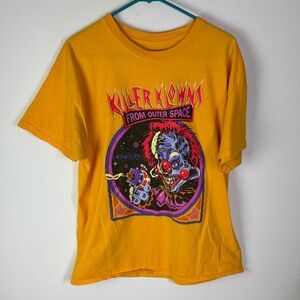Gently Used Killer Klowns from Outer Space Goodie Two Sleeves T-Shirt. This is a men's XL. Yellow throughout with large multicolor Killer Klowns from Outer Space design on the front. Kind of a retro look to it. 100% cotton.