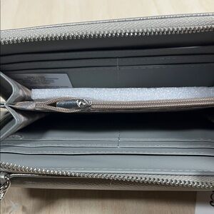The Christian Lacroix Blake Pebble Flap Zipper Wallet Wristlet is a stylish accessory designed for women. Made of polyester and vinyl materials, this wallet features a solid silver color with pebble accents, adding a touch of elegance. The wristlet style and Credit Card feature make it practical for everyday use, while the designer logo accents showcase a sense of luxury. Perfect for those who appreciate designer accessories with a blend of functionality and fashion.