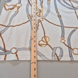 Elevate your wardrobe with this sophisticated Chico's mock neck sweater, adorned with a captivating beige base and an intricate pattern of gold chains and equestrian-inspired straps. The shimmering metallic threads woven throughout the fabric catch the light beautifully, adding a touch of subtle glamour to your ensemble. Designed with a flattering mock neck and long sleeves, this sweater offers both comfort and timeless style. Perfect for a chic evening out, a polished office look, or a stylish brunch with friends.