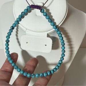 This necklace is Turquoise or Howlite with a rich blue color and gorgeous veining in person. This beaded necklace is strung up by a purple paracord and is adjustable. You can wear this as a choker, midline or long length necklace. No matter what this necklace is the perfect length.