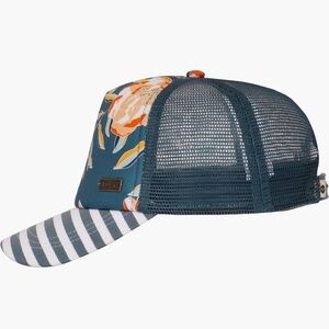 Vibrant cap with floral front and striped brim. Mesh back for breathability.