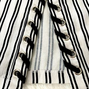 Stylish pencil skirt with vertical stripes. Features dramatic, yet classy, lacing. Lined. Reposhing. The fit unfortunately was not for me. This will probably fit a true small better. 14” waist lying flat with fitted hips for a smart, sexy look.