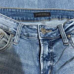 These Silver Jeans feature a relaxed boyfriend fit in a classic blue hue, highlighted by subtle distressed details for a vintage-inspired look. The light to medium wash enhances the casual appeal, making them a versatile choice for everyday wear. Enjoy the perfect blend of comfort and style with these effortlessly chic jeans.