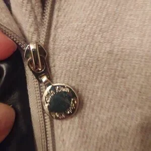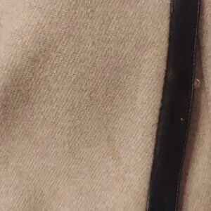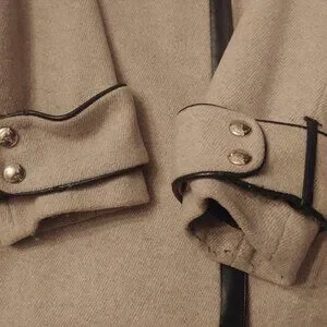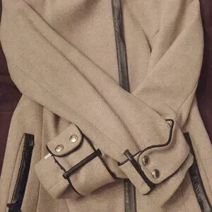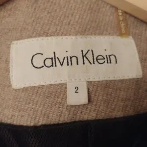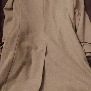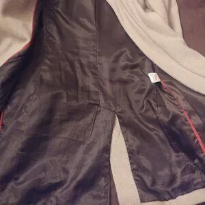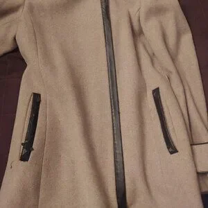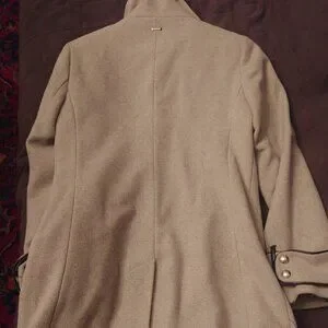 Pre-owned condition. Classy coat and versatile. Never goes out of style. Size 2. An oatmeal/cream type of color. The zippers work. Asymmetrical unique closure. There are some small stains. Not too noticeable. Some flaws like cracks on the material lining the pockets- thus low price. But warm and still have a lot of life in it. I am slightly above 5'5 in height and it hits right above the knee for me.