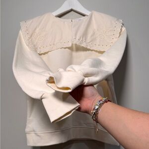Brand new Zara girls sweatshirt in a soft cream/ivory shade. Pretty eyelet lace collar, puff sleeves, and a cozy sweatshirt feel — really cute for school, pictures, holidays, or everyday outfits. Never worn, still has the original tags attached.
