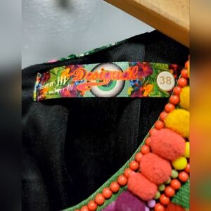 Designed with a sleeveless cut and lined for extra coverage, this size medium dress (38) is easy to care for with its hand wash only requirement. The button closure provides a seamless fit, making it a practical choice for a festive occasion. With its mix of colourful style and chic accents, the Desigual Aya dress is sure to turn heads and elevate your fashion game. In very good used condition with a few missing beads.
