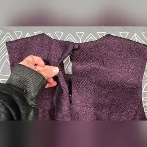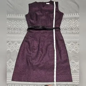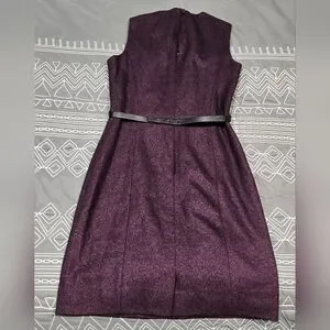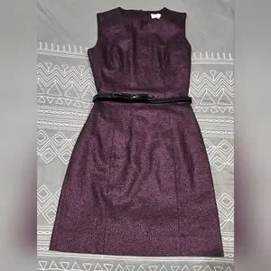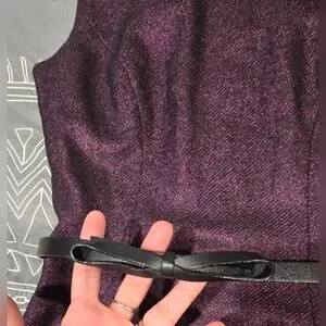 Great condition. Size 0. Deep purple in color with sparkle. Above the knee. Zipper and button back closure. Keyhole back detail. Belted with bow detail on front. Belt has a couple different belt holes. Feels Like leather. Measurements and fabric content listed above in pictures.