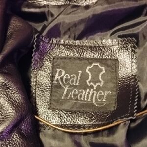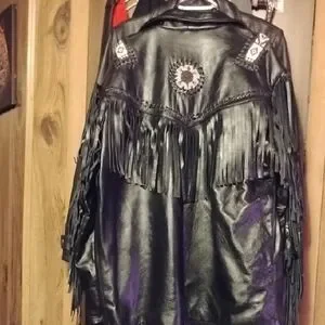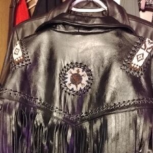 Women's size medium heavy black leather jacket with fringe & tribal patterns with beads. In excellent condition. Made real heavy like a motorcycle jacket. Worn only once.