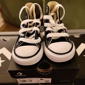 Classic black high-top sneakers with white laces. Iconic Converse logo on the side.
