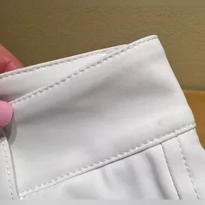 - These white breeches are clean but have very lite saddle staining on the butt that occurs with just 1 or 2 rides + a couple of lite spots from a belt (which would be hidden under a belt).
