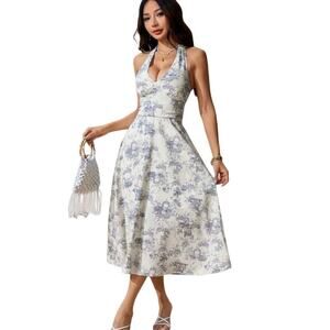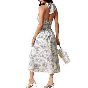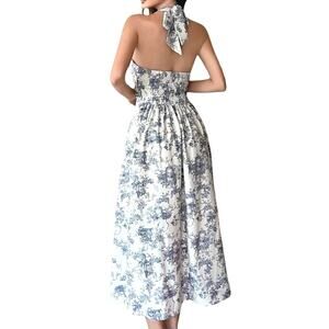 French VTG Style Blue White Porcelain Print Toile De Jouy Halter Neck Midi Dress Cinched Waist Size Large Womens
