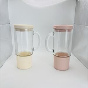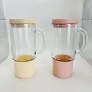 The Lot of 2 Ello 18 oz Glass Travel Mugs are premium quality glassware with a beige color and a convenient handle and lid. This set includes two travel mugs from the reputable brand Ello, perfect for enjoying your favorite hot or cold beverages on the go. The mugs feature a stylish design and are ideal for those looking for a durable and high-quality option for their daily commute or outdoor adventures.