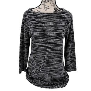 Keywords: Daisy Fuentes, knit dress, striped dress, boat neck, 3/4 sleeve, casual dress, everyday wear, black and white, modern, comfortable, pullover dress, midi dress, workwear