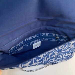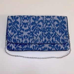 Beautiful blue and gray fold over clutch/shoulder bag. Magnetic closure with silver chain strap. Inside has blue fabric lining with 1 zip pocket. 100% cotton.