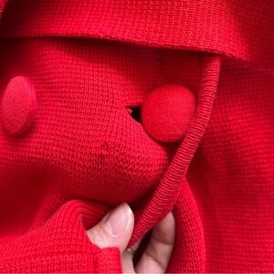 Will fit a size medium best. Measurements are shown in photo. This jacket is stunning! Needs to be dry cleaned as it has a small spot on the back. One tiny spot of wear on front with a snag