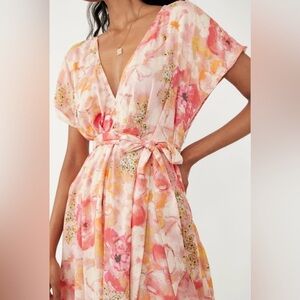Spring is in the air! Beautiful print dress by Free People has a tie at the waist and a relaxed short sleeve. The perfect dress for enjoying a night out with friends, garden weddings, baby showers and the list goes on! Wear with a cute jean jacket or cashmere poncho.