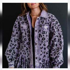 Stylish corduroy jacket. Features a fringed hem and button-up front. Perfect for casual outings. Animal leopard print and a blue green color. so cute! purchased from @thinkpinkbtq but it was too big for me. nwt. see last 3 photos for inspiration on look of jacket but my jacket is more of a green blue mineral washed hue than the gray shown.
