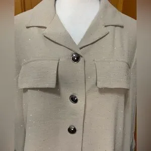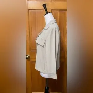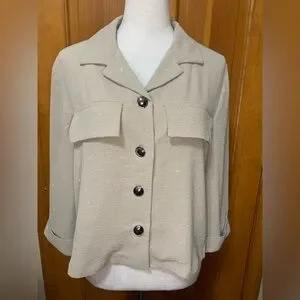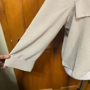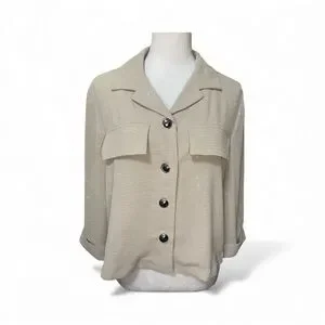 Stylish beige button-up blouse with faux front pockets. Perfect for a chic look.
