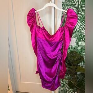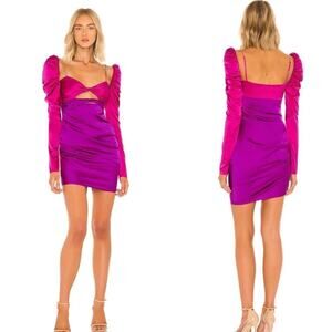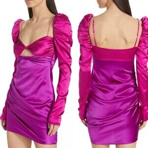 The Bar's signature twist-front minidress is crafted of lustrous silk satin. This two-tone style flaunts a sweetheart neck, adjustable rhinestone-embellished straps, and long puff sleeves filled with tulle.