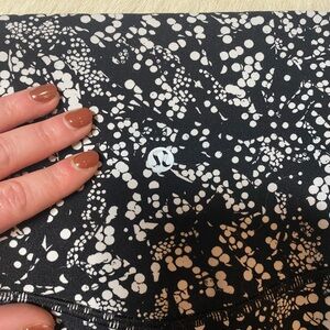 Color/Pattern: The design is a black background with a dense, all-over white speckled or dot pattern. This particular pattern has been released by Lululemon under several names over the years, including "Chirasu Black", "Urban Block Ice Grey Black", and "Speckle Trail Black Multi".