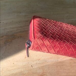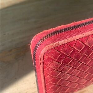 Distinctive woven supple leather wallet by Bottega Veneta. It is in vintage, pre-loved condition. It can use some leather dye to revive its original beauty. Please manage your expectation accordingly. Inside is clean, zippers are working great. Perfect project piece or use it as is. Grab it today!