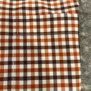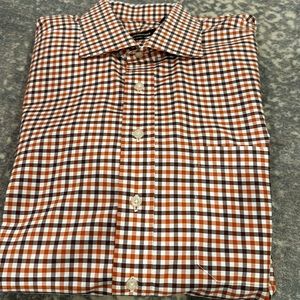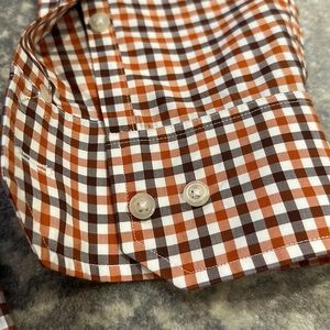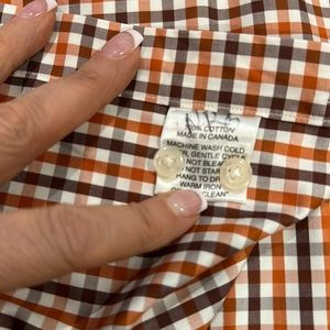 PAUL STUART ORANGE BROWN AND WHITE COTTON SHIRT WITH FRONT POCKET HAS ONLY BEEN DRY CLEANED AND HAS JUST BEEN AS WELL. PERFECT CONDITION AND GREAT FOR FALL AND THANKSGIVING. THE BRIGHT COLOR IS HOW IT LOOKS