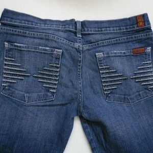 Keywords: Seven For All Mankind, denim, jeans, women's, blue wash, straight leg, designer denim, distressed pockets, casual wear, everyday, versatile, fashionable, premium denim