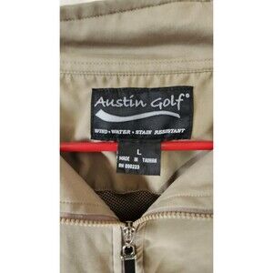 Austin Golf windbreaker pullover in size Large, featuring a tan lightweight design with vented back, removable zip-off sleeves, adjustable drawstring hem, and Velcro cuff closures; preowned and in great condition with normal light wear.