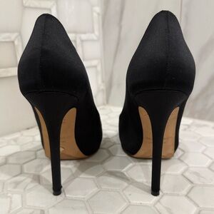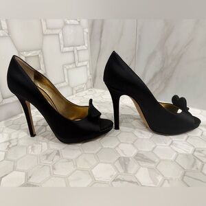 Kate Spade Collana Black Satin Peep-Toe Heels with heart detail. Size 9.5 B