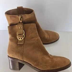 Elegant tan ankle boots with buckle detail. Perfect for versatile styling.