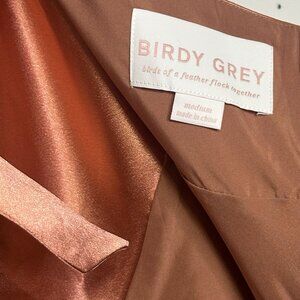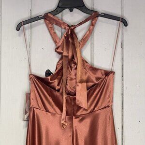 This listing is for a new with tags Birdy Grey Monica shiny satin 'Terracotta' bridesmaids formal maxi length dress in a size medium. This dress was made in China and is made of 100% polyester. Measurements are: front top of collar to bottom vertically is 64“, back top of collar to bottom vertically is 64“, chest (pit to pit) is 32“, waist is 28”, hips is 42“, and bottom hem of dress is 56“. Please see all listing photos, as this listing is for sale in as/is new with tags condition.