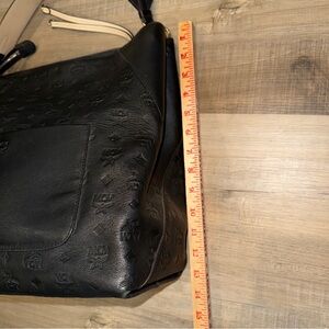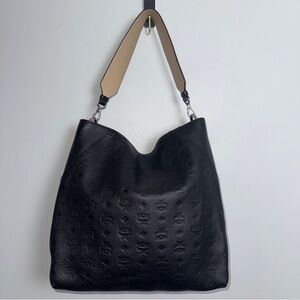 Chic MCM shoulder bag in black leather. Features tan accents. Perfect for everyday use. 100% authentic. Comes with original dust bag. Very good condition inside and out.