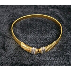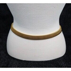 This bold and stylish 1980s stretch belt is the perfect statement accessory for dresses, jumpsuits, or high-waisted looks. Featuring a flexible gold-tone ribbed band with a sculptural twisted-bar front clasp, the closure is accented with silver-tone ribbed rings for a chic two-tone finish. The metal stretch band offers a comfortable and adjustable fit, making it both wearable and eye-catching.