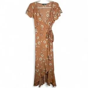 Audrey 3+1 Floral Wrap Maxi Dress Peach Boho Ruffle Hem Short Sleeve Small