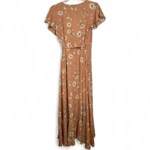 Bring effortless boho vibes to your closet with this Audrey 3+1 floral wrap maxi dress. Features a soft peach color, adjustable tie waist, flutter sleeves, and a flowing ruffle hem. Lightweight and perfect for warm weather, vacations, brunch, or weddings. Excellent pre-owned condition.