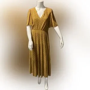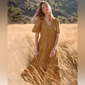 Garnet Hill Gold Maxi Dress Loose Flowy Fit Boho Short Sleeve Woman Size Medium