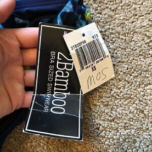 NEW NWT 2BAMBOO Navy Blue Green White Geometric Mesh Waist Boho Bikini Bottom XS